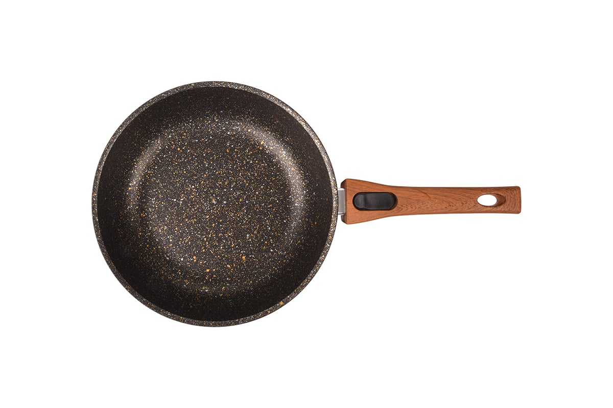 Сковорода Kukmara 240 мм со съемной ручкой, со стеклянной крышкой, антипригарное покрытие линия Granit ultra black-gold сгбг243а подходит и для жарки, и для тушения. Сковорода из литого алюминия традиционной формы имеет отличные теплораспределительные и теплоаккумулирующие свойства, и блюда в ней получаются сочными и ароматными.