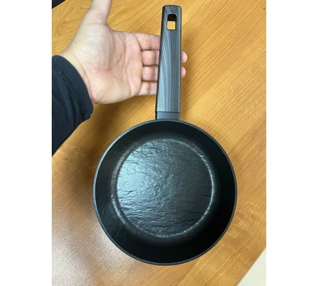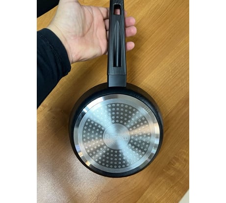 Яичница, приготовленная с каплей масла (а оно должно быть для вкуса), просто съезжает аккуратно целиком в тарелку при наклоне сковороды. Ничего не пригорает. К этой сковороде идеально подошла крышка 33772279.