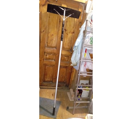 Товар очень пригодился, поскольку снег этой зимой ложился слоями и не сходил ни разу сам( металлочерепица) . С помощью скребка и 4 алюминиевых труб по 2 метра, приобретенных на ... (20, 25,30,35 мм) и соединенных телескопом изготовил 8 метровый инструмент ( кстати отверстие на скребке 22 мм и труба 20 мм встала как родная) и очистил снег с крыш домов, сарая, навесов и соседке зачистил теплицы. Ручка конечно тяжеловата, но пока руки позволяют...