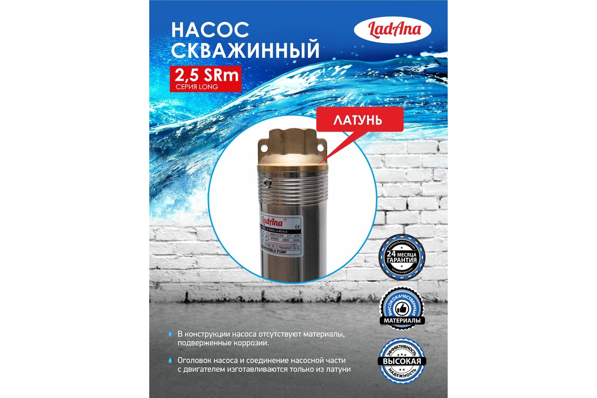 Скважинный насос LadAna 2,5 SRm 3-45-0,4 кабель 20 м с евровилкой 040505024 серия LONG (с встроенным конденсатором) предназначен для перекачивания чистой и слабозагрязненной воды из скважин с максимальным содержание примесей не более 250 г/куб.м.