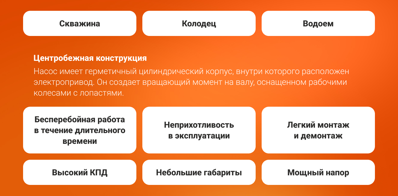 Производительность: Быстро и стабильно качает воду. Компактный размер: Легко помещается в скважину.