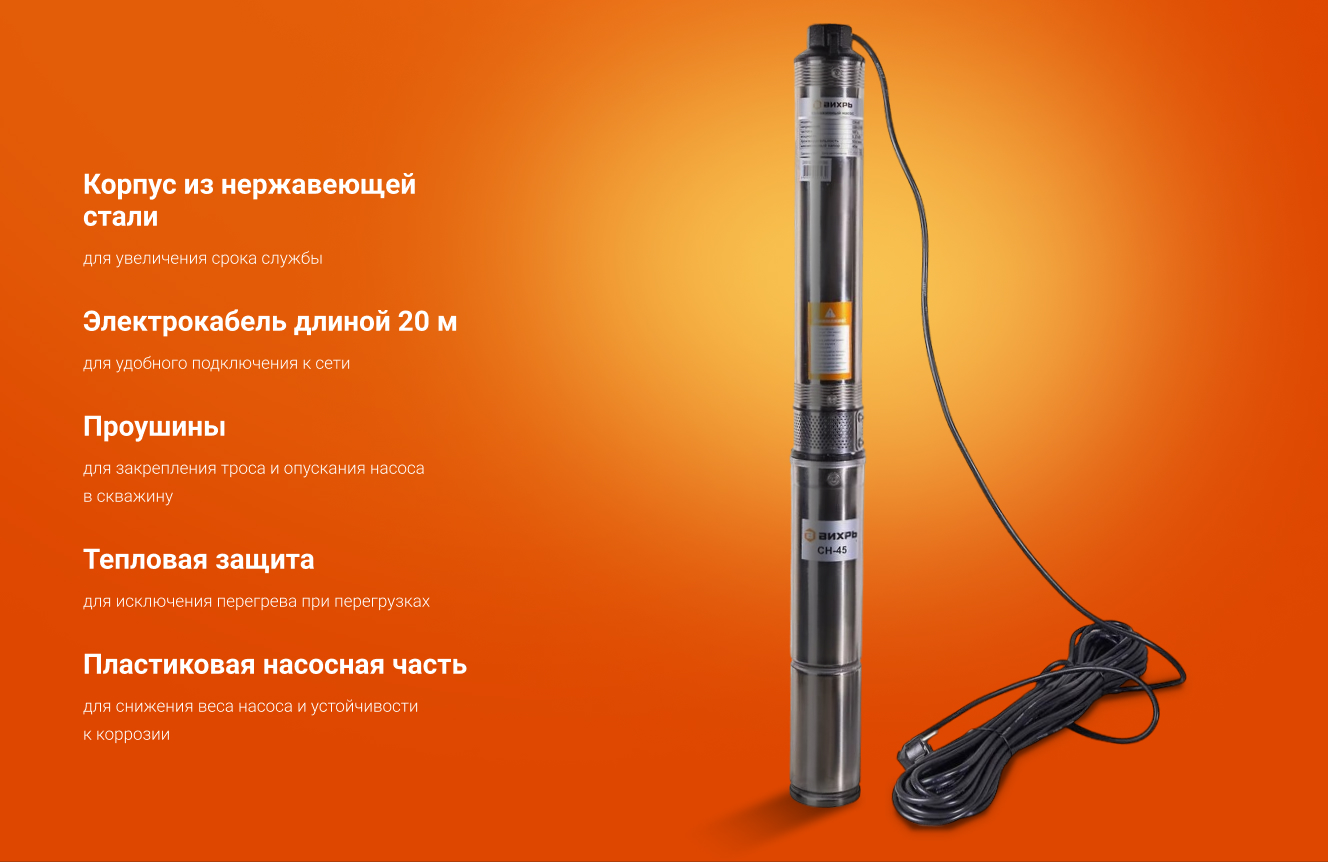 Скважинный насос Вихрь СН-45 может погружаться на глубину до 35 м. Внутри корпуса установлен набор из плавающих импеллеров высокой прочности. В процессе работы они не соприкасаются друг с другом, что повышает эксплуатационные характеристики. Насосная часть изготовлена из пластика, что позволило снизить вес устройства до 8,52 кг. Температура перекачиваемой воды составляет от +1°до +35° С.