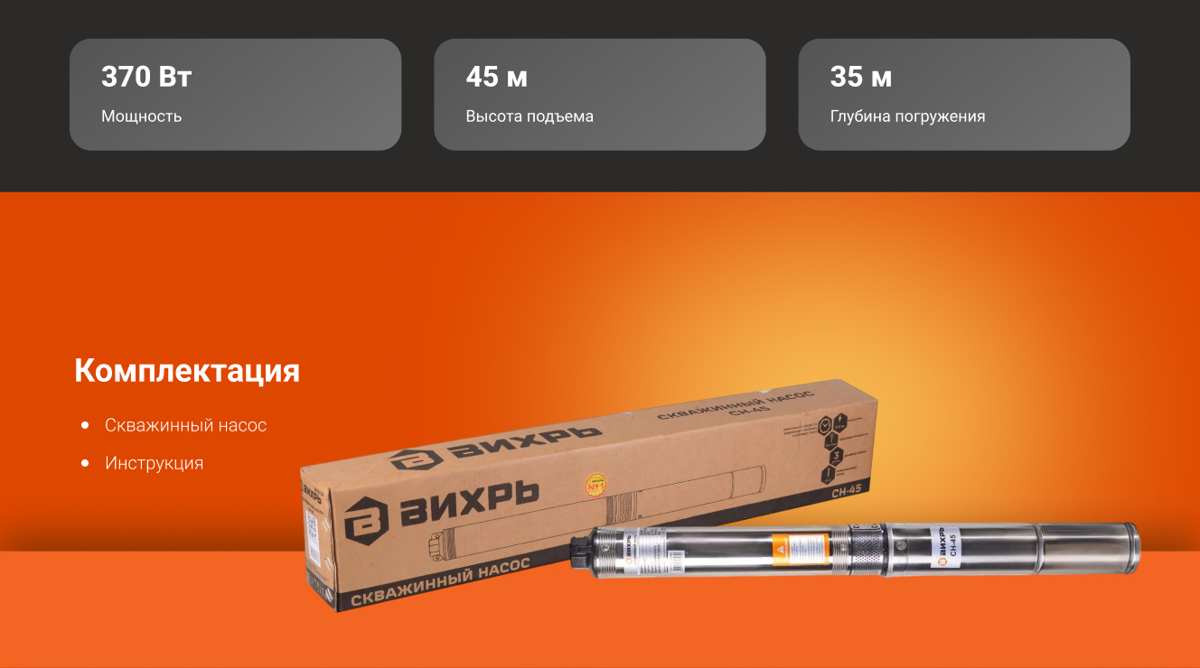 Нужен был насос в скважину на даче, взял "Вихрь" СН-45, по совету соседа. В целом, доволен. 45 метров напора мне хватает с запасом, скважина у меня неглубокая. Качает воду бодро, напор хороший. Поливаю огород, дом водой обеспечиваю - без проблем. По характеристикам все как заявлено. Провод длинный, достал до розетки без проблем. Корпус крепкий, не хлипкий. Работает тихо, жужжит себе спокойно. Подключил без проблем, разбираться особо не пришлось. За месяц использования нареканий нет. Главное, что вода есть, и насос работает. Для моих нужд - идеально. Цена адекватная, не переплатил. Думаю, прослужит долго.