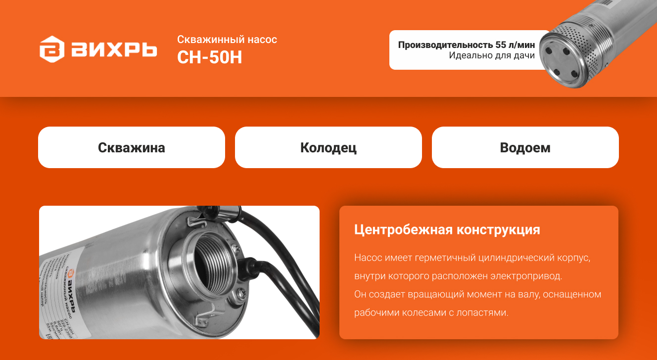 Вихрь СН-50Н отличается простой конструкцией. Для производства насосной части используется пластик, а корпус насоса изготовлен из нержавеющей стали. Насос с защитой IPX8 рассчитан на длительное погружение под воду. Защита от пыли не предусмотрена, так как она отсутствует в водной среде, где работает устройство. Характеризуется высокой надежностью, способен перекачивать по 55 л/мин. Забор воды происходит снизу. Благодаря особенностям конструкции, допустимо высокое содержание песка (не более 180 г/м³).