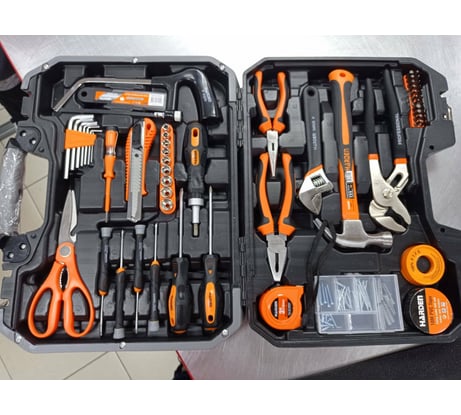 Очень продуманная комплектация. 5 лет использовал для домашних работ аналогичный набор, только хуже по исполнению и дешевле. Ящик хороший, достаточно крепкий, но разводной ключ и клещи еле держатся и иногда вываливаются. Качество инструментов приемлемое для бытовых нужд. Есть запасные полотна для ножовки и лезвия для ножа.