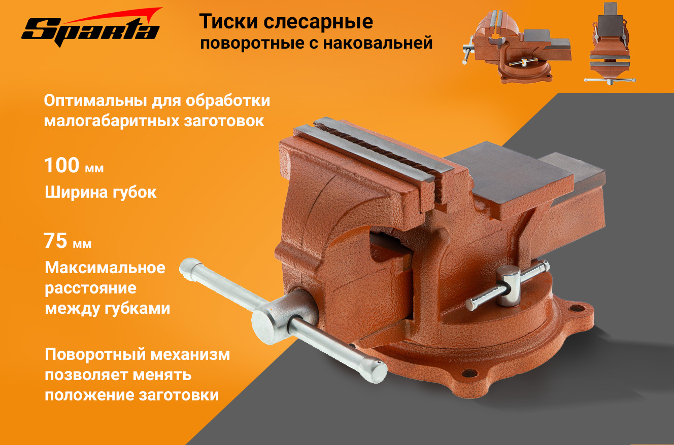 Поворотные слесарные тиски Sparta 186235 с наковальней и губками шириной 100 мм, — инструмент для захвата деталей размером до 75 мм. Будут полезны для обработки малогабаритных заготовок в частной мастерской или гараже.
