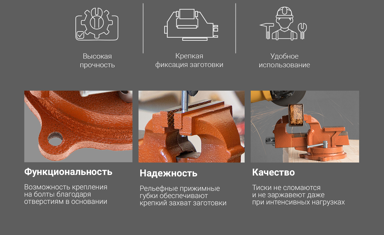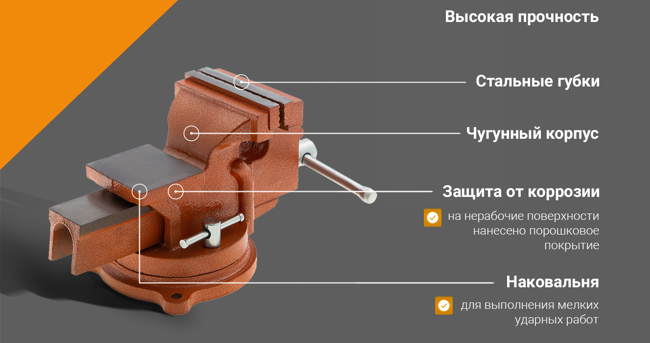 - Высокая прочность — корпус выполнен из чугуна, а губки — из стали