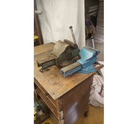 Маленькая наковаленка,но она мне и не нужна, на тисках стучать мне не позволяет воспитание. Не массивные,на производство не пойдут,скорее больше для гаража