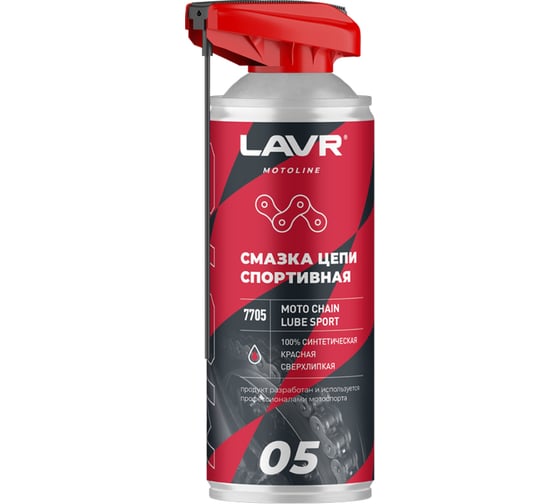 Смазка цепи спортивная 520 мл LAVR MOTO Ln7705 - красная синтетическая смазка нового поколения разработана для цепных приводов спортивных и гоночных мотоциклов. Защищает цепь в условиях повышенной нагрузки и соревнований. Красный цвет позволяет контролировать нанесение и остаточное количество смазки. Присадки, повышающие прилипание, удерживают смазку на цепи при скоростях выше 250 км/ч при любой погоде.