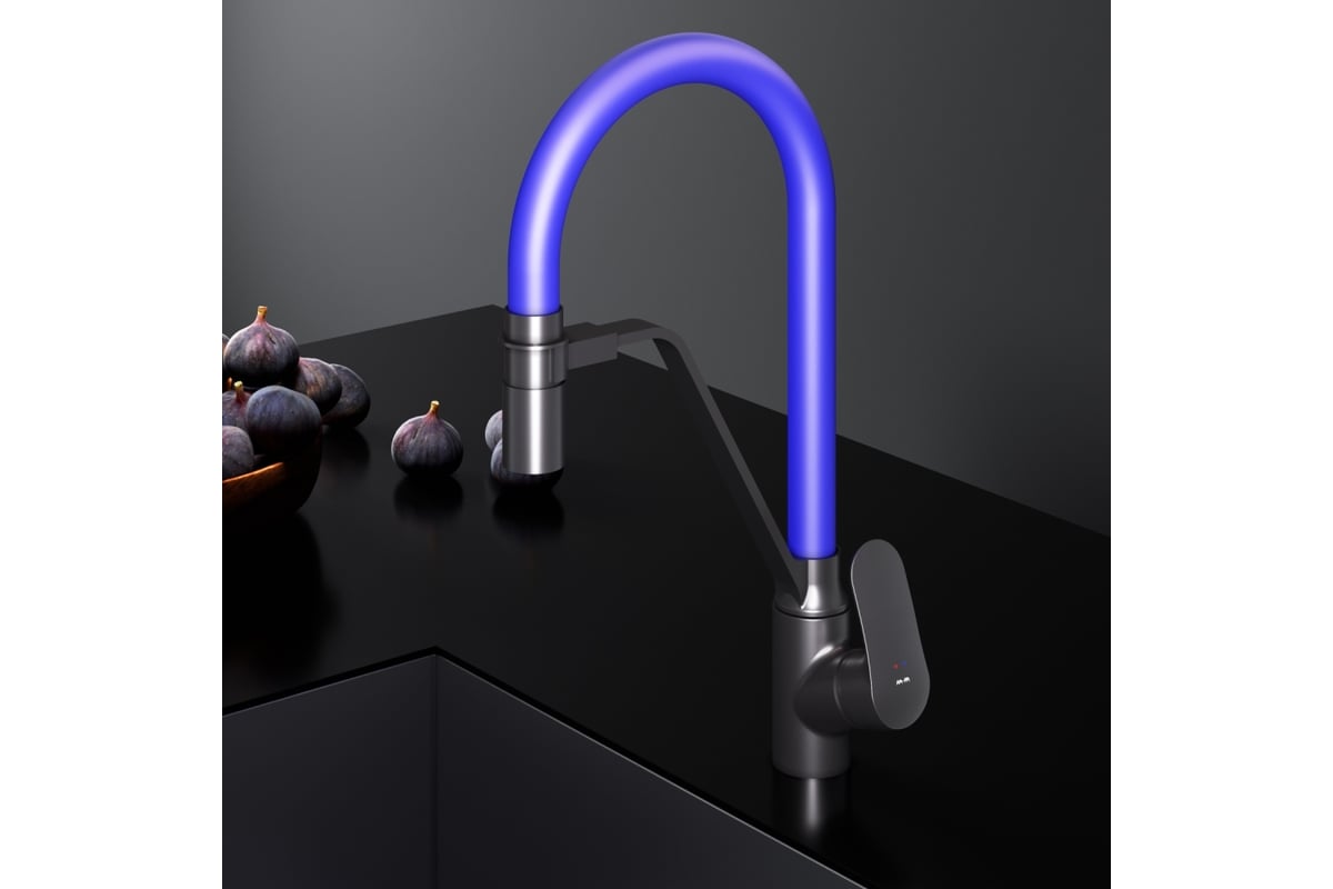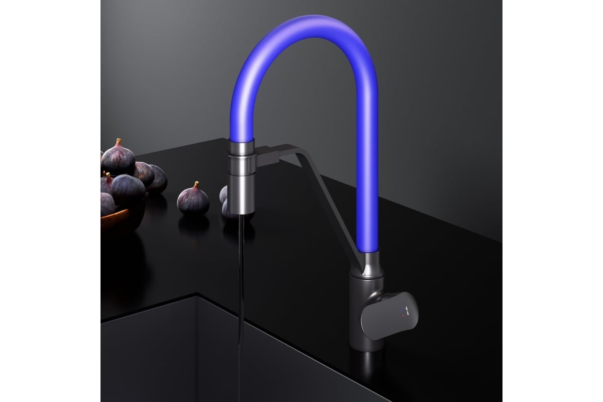 Эффектное сочетание цветов - матовый черный корпус смесителя и синий цвет излива станет ярким дизайнерским решением на кухне.