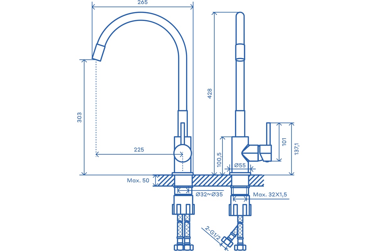 Максимальная длина излива составляет 225 мм, а высота – 303 мм, что позволяет легко мыть посуду и наполнять большие емкости водой.