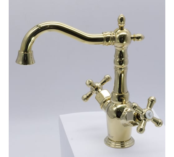 Двухвентильный смеситель для раковины в ретро-стиле с поворотным изливом станет выразительным акцентом умывальника, сочетая декоративный золотой оттенок и традиционный дизайн. Округлая форма корпуса и крестовые рукоятки создают классический образ, который гармонично впишется как в винтажный, так и в современный интерьер ванной комнаты.