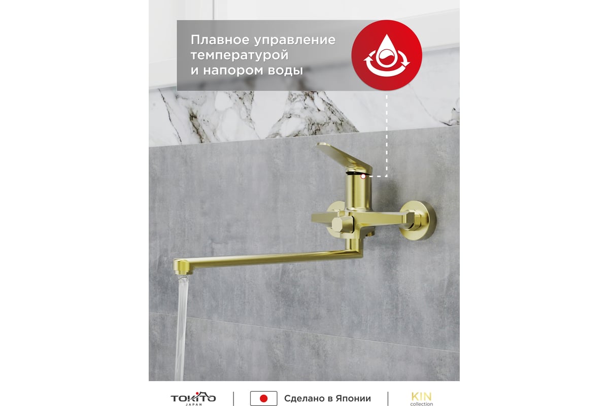 Смеситель для ванной комнаты и душа золотой с длинным изливом TOKITO разработан с учетом всех современных технологий, что обеспечивает бесперебойную работу на длительный период.