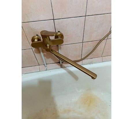 Цвет золотой сатин матовый, практически не пачкается и не оставляет вообще никаких отпечатков в отличии от хрома, большая годная лейка и качественный крепеж, сидит как влитая и ничего не болтается. Шланг тоже хорошего качества. Гусак тяжеленький, сделан явно не из фольги.