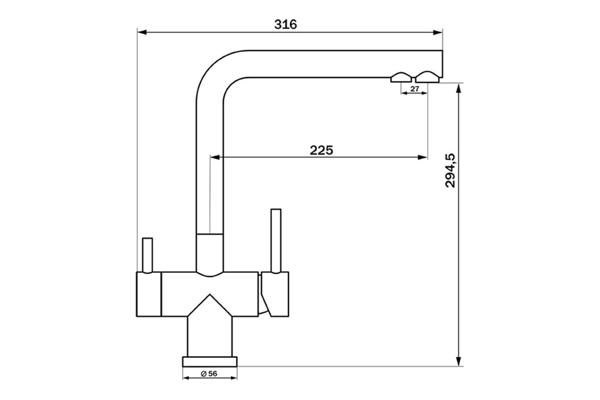 Смеситель произведен из высококачественной нержавеющей стали, безопасной для здоровья, и оснащен керамическим картриджем, рассчитанным на интенсивную эксплуатацию. Функциональным дополнением модели является возможность подключения фильтра для питьевой воды. Подача фильтрованной воды осуществляется через отдельную трубку и регулируется специальным керамическим переключателем.