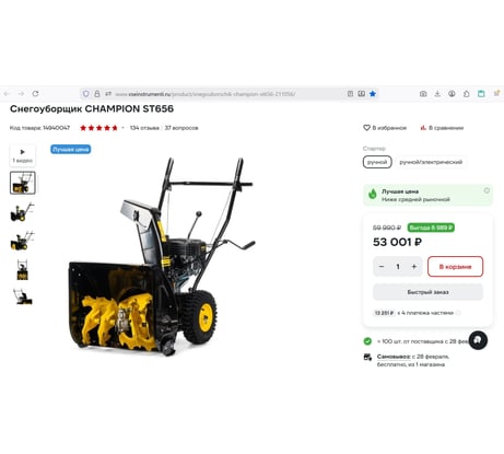 Настоящий бензиновый зверь! У меня раньше был электрический снегоуборщик, ну это небо и земля. Этот прет, что танк и ему не страшны никакие сугробы! Очень доволен.