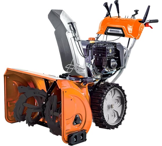 Модель оборудована плавной регулировкой газа, изменяемым направлением выброса, большой заливной горловиной и металлическим шнеком с зубцами для комфортной и производительной работы. На верхней части ковша закреплена лопатка для очистки желоба.