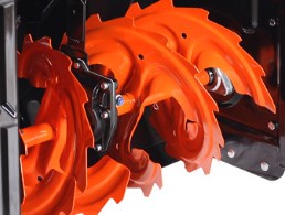 - Двухступенчатая система металлических шнеков разбивает слежавшийся снег;