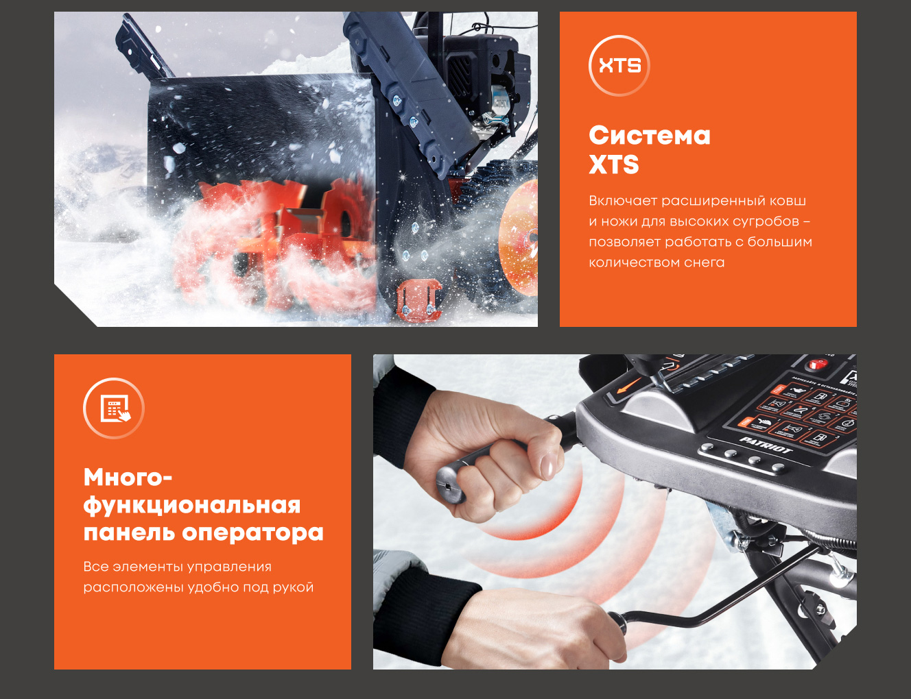 Управление вынесено на отдельную панель, дающую быстрый доступ ко всем его элементам. Снегоуборщик оснащен системой подогрева ручек.