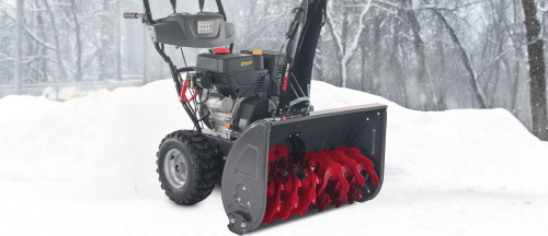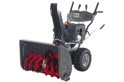 Снегоуборщик обладает двуступенчатой системой очистки, что гарантирует отличную производительность и высокое качество уборки. Это позволяет быстро и без повторных проходов очищать большие площади.