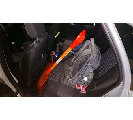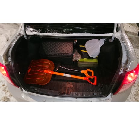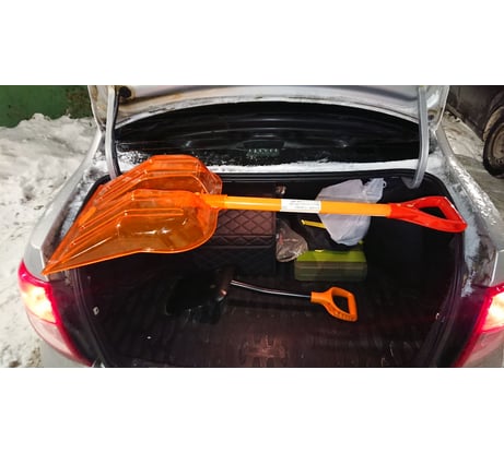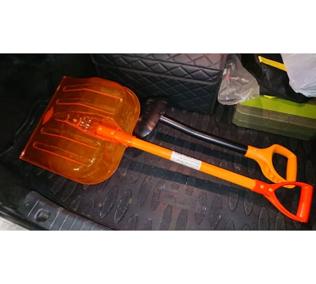 Лёгкая, яркая (это наиболее важно в зимний период), по меркам пластиковых лопат достаточно прочная. Если багажник машины вдруг занят полностью, то лопата абсолютно спокойно помещается в салоне за пассажирским сидением, причём не "лёжа", а "стоя" (видно на фото).