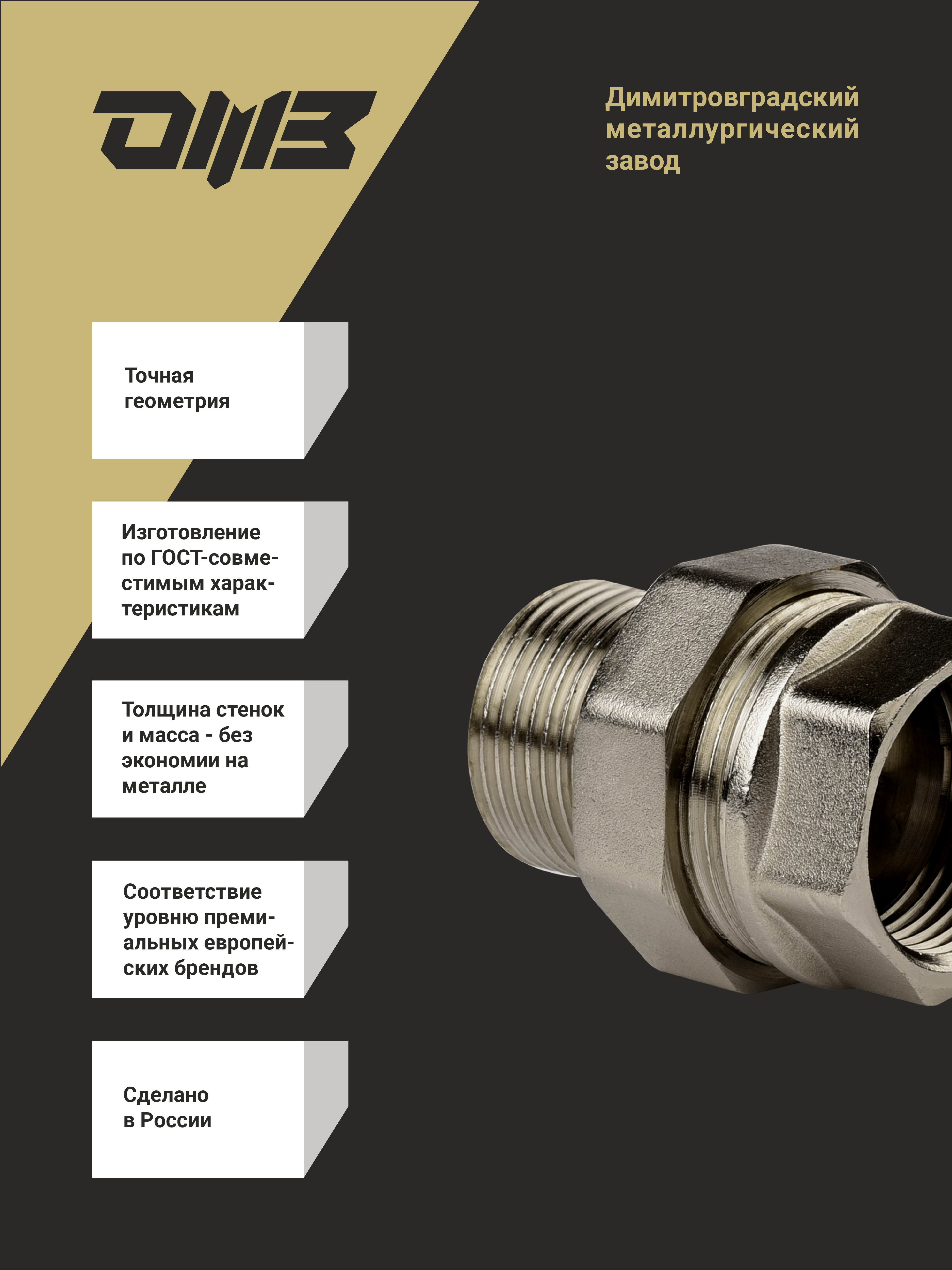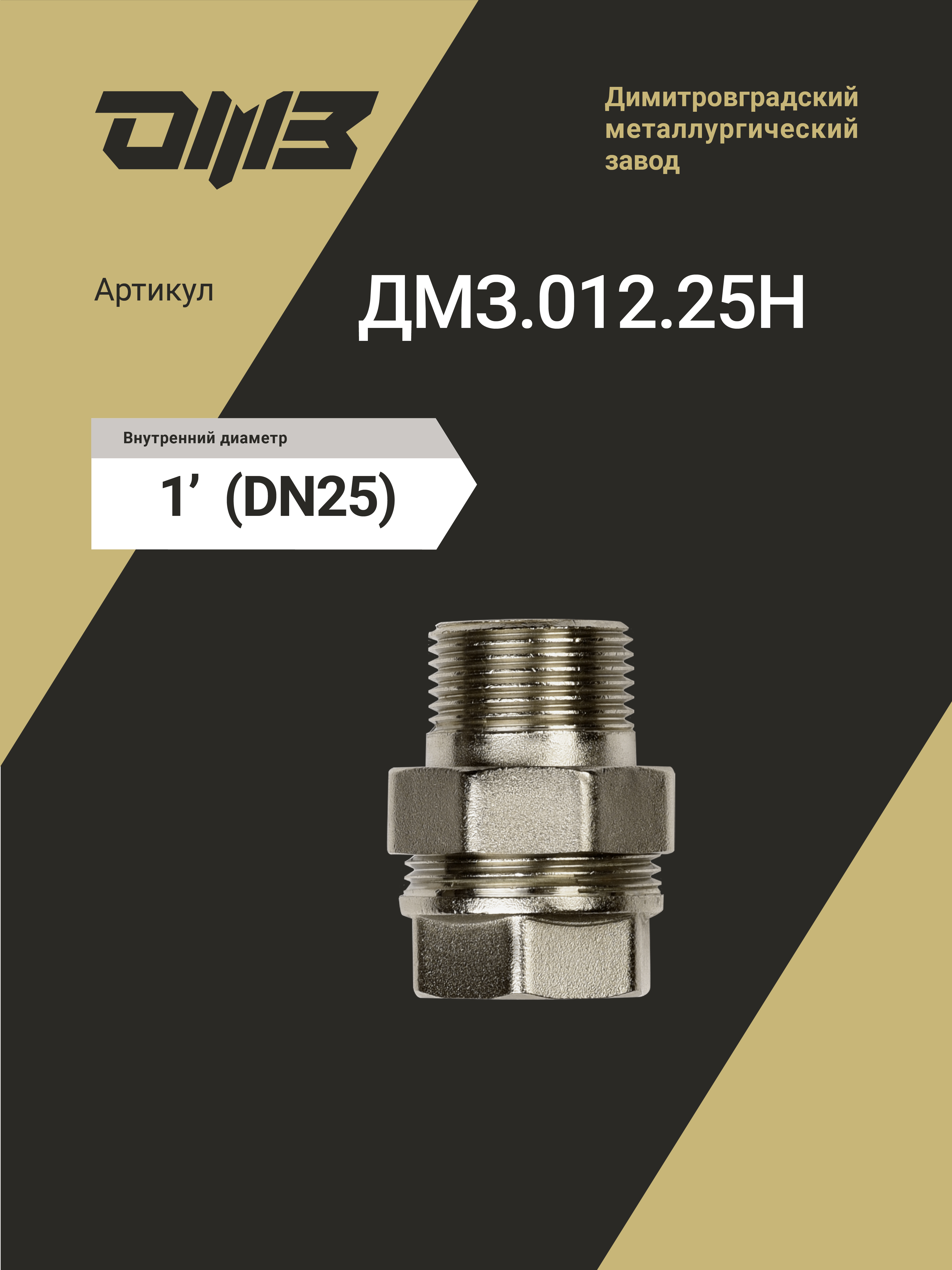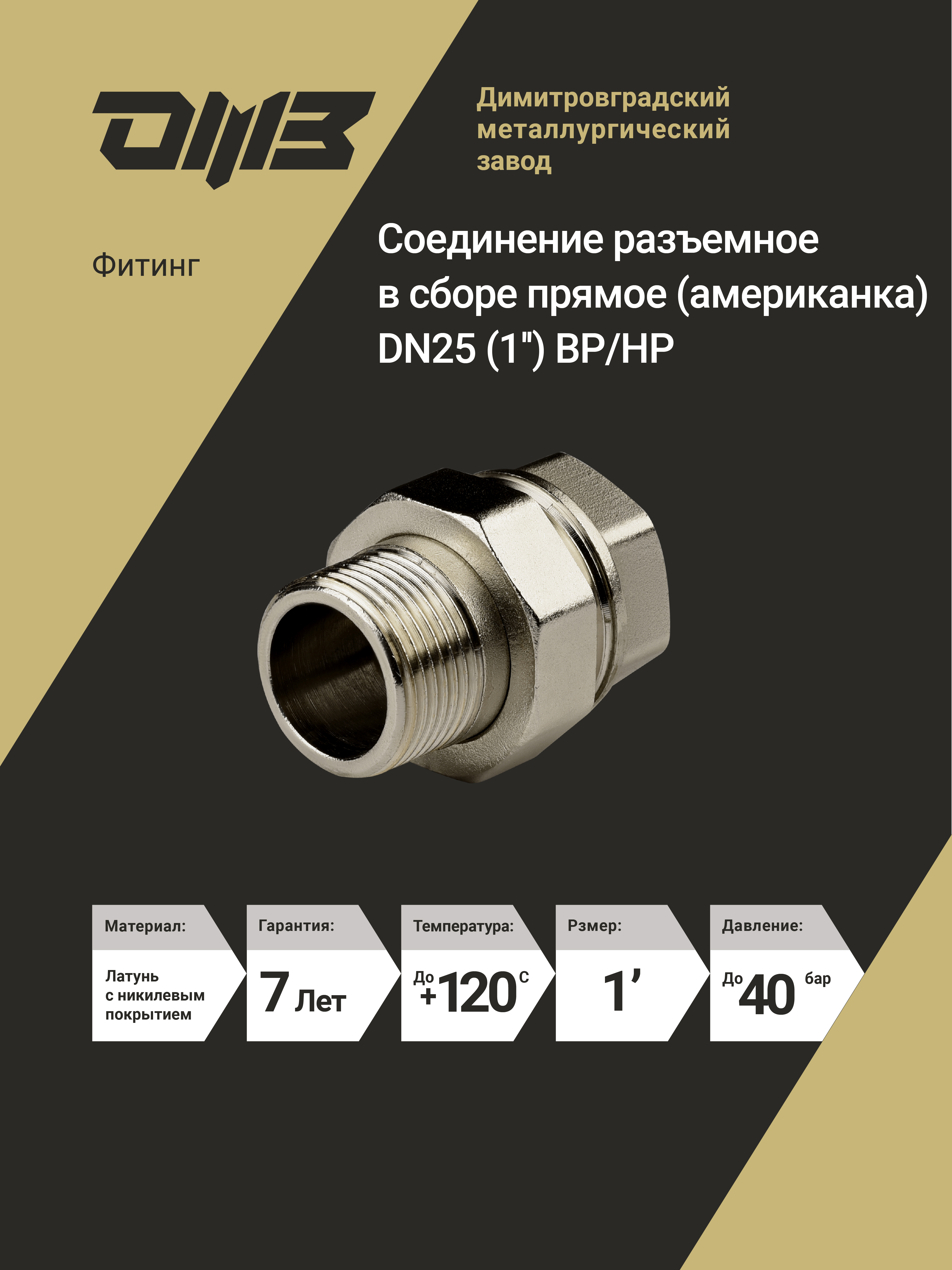 Соединение разъемное в сборе прямое (американка) ДМЗ DN25 (1'') ВР/НР латунь никель (упаковка 5 шт) ДМЗ.012.25Н5