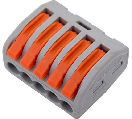 Соединительная клемма с рычагами 5 отверстий (SKL222O-5-Gr) аналог Ваго (Wago) с плоско-пружинным зажимом, используется для подключения светильников, соединения проводов, а также подключения других электротехнических изделий. Клемма выполнена из негорючего пластика. Позволяет оперативно разбирать и собирать электрическое соединение. Часто используется для временной проводки. Такие клеммники с рычажком существенно облегчают электромонтажные работы. Они подходят для многоразового присоединения, поскольку при необходимости можно поднять рычажок и извлечь жилу.