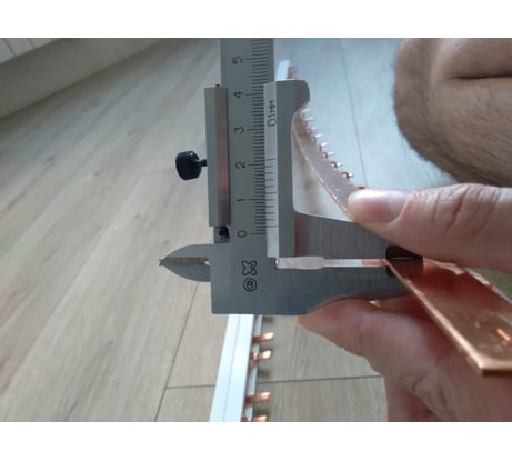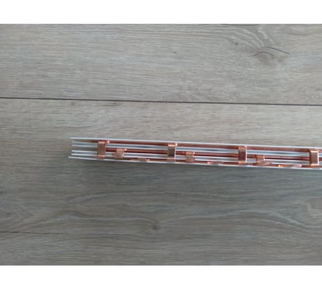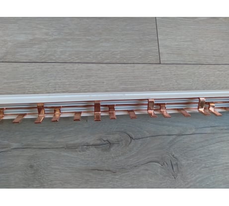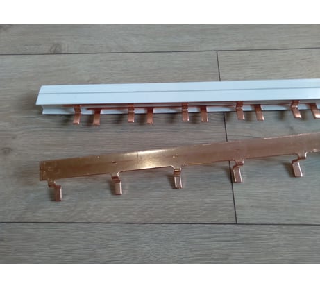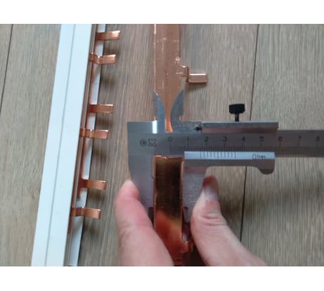 1. Довольно мощные медные шины. Сечение основной шины по грубым измерениям равно 17*2=34мм2 (Смотрите фото), что согласно требованиям ПУЭ соответствует токам 100А и даже немного больше. Сечение отводов по грубым измерениям равно 6*2=12мм2 (Смотрите фото), что согласно требованиям ПУЭ соответствует токам порядка 60А. 2. Сама конструкция всей гребенки вызывает уважение, довольно мощная, претензий к ней нет. 3. Длина пластиковой части немного больше длины шин, что позволяет подрезать ее с запасом и утопить шины внутри нее, не применяя защитные колпачки по торцам.
