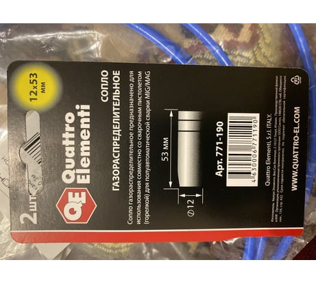 Отзывы о сопле газораспределительном (2 шт; 12x53 мм) для горелок MIG/MAG QUATTRO ELEMENTI 771-190