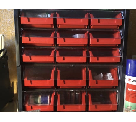 Удобный органайзер. Брал для столярной хоббийной мастерской. Благодаря шторке в ячейки не попадает пыль. Доставанию предметов из ячейки она не мешает.