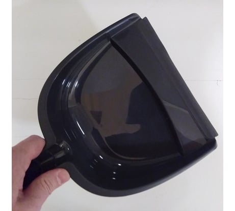 Изделие выполнено аккуратно, без заусенцев, из эластичного глянцевого пластика. Изготовлено в соответствии с ГОСТом. Маркировка на обратной стороне: "PP" и пятёрка в треугольнике -- полипропилен. Это значит, совок не хрупкий, в процессе эксплуатации растрескиваться и ломаться не должен. Оконцовка ковша -- из мягкой резины с тонким краешком, под цвет совка, имеет длину 210 мм. Удачное приобретение.