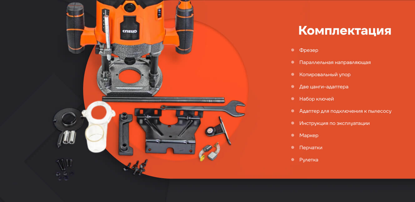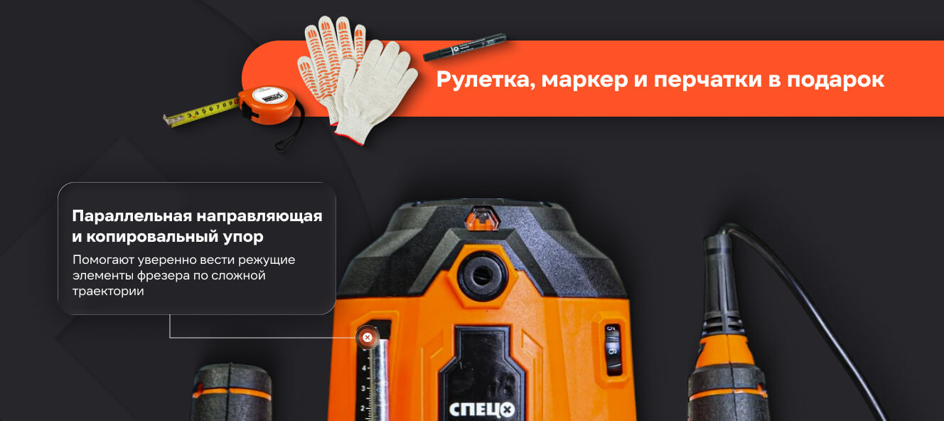 Универсальный фрезер Спец МФУ-2000 нов. дизайн ,2000 Вт,12000-26000 об/мин, 6-8-12 мм+ маркер + трикотажные перчатки + рулетка 5 м х 18 мм СПЕЦ-4038/3385/8058/3601