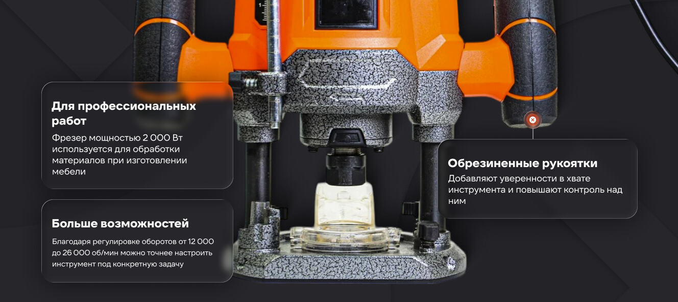 Предназначен для фрезерования древесины, прорезания пазов и канавок, снятия фасок, профилирования, фрезеровки различных декоративных рисунков и подгонки краев обрабатываемых деталей при выполнении столярных и различных ремонтных работ в бытовых условиях.
