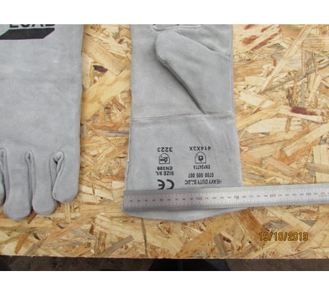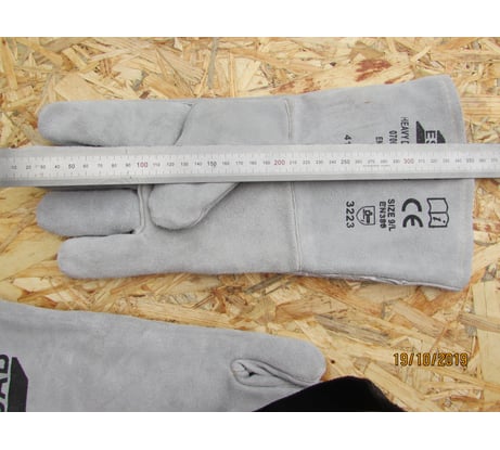 Хорошие краги. В описании указано что они из коровьей кожи, по факту спилок, но очень хороший. Не рыхлятина. Длина 350мм, ширина раструба 160мм. Покупать более дорогие не вижу смысла.