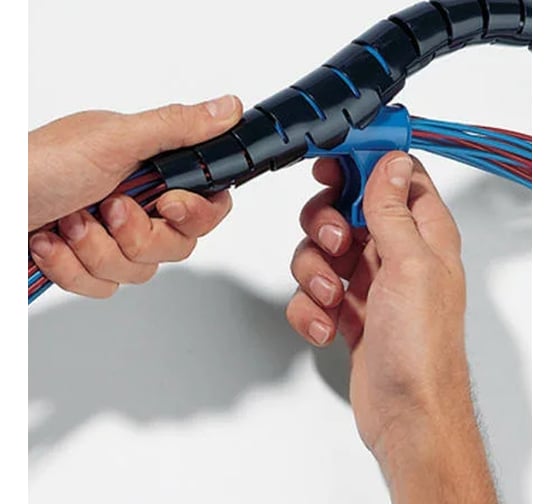 Применение спирального защитного рукава для электрических проводов и кабелей позволяет собирать их в отдельные пучки и организовывать группы проводов, связанных отдельной оплеткой. Специальный разрез в конструкции защитного рукава позволяет выводить отдельные кабели и провода из общей сборки на любом участке монтажа всей кабельной трассы. При этом сохраняется возможность легкого доступа к проводам и кабелям для ремонта или замены.