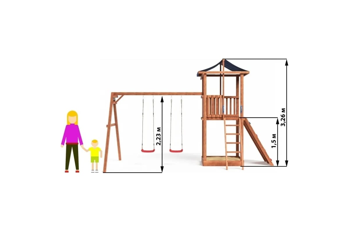 Размеры и вес комплекса: Высота общая - 326 см; Высота от земли до пола - 150 см; Ширина общая - 315 см; Ширина от башни до узкой лестницы - 208 см; Длина общая - 500 см; Длина от качели до башни - 412 см; Общий вес: 165,8 кг.