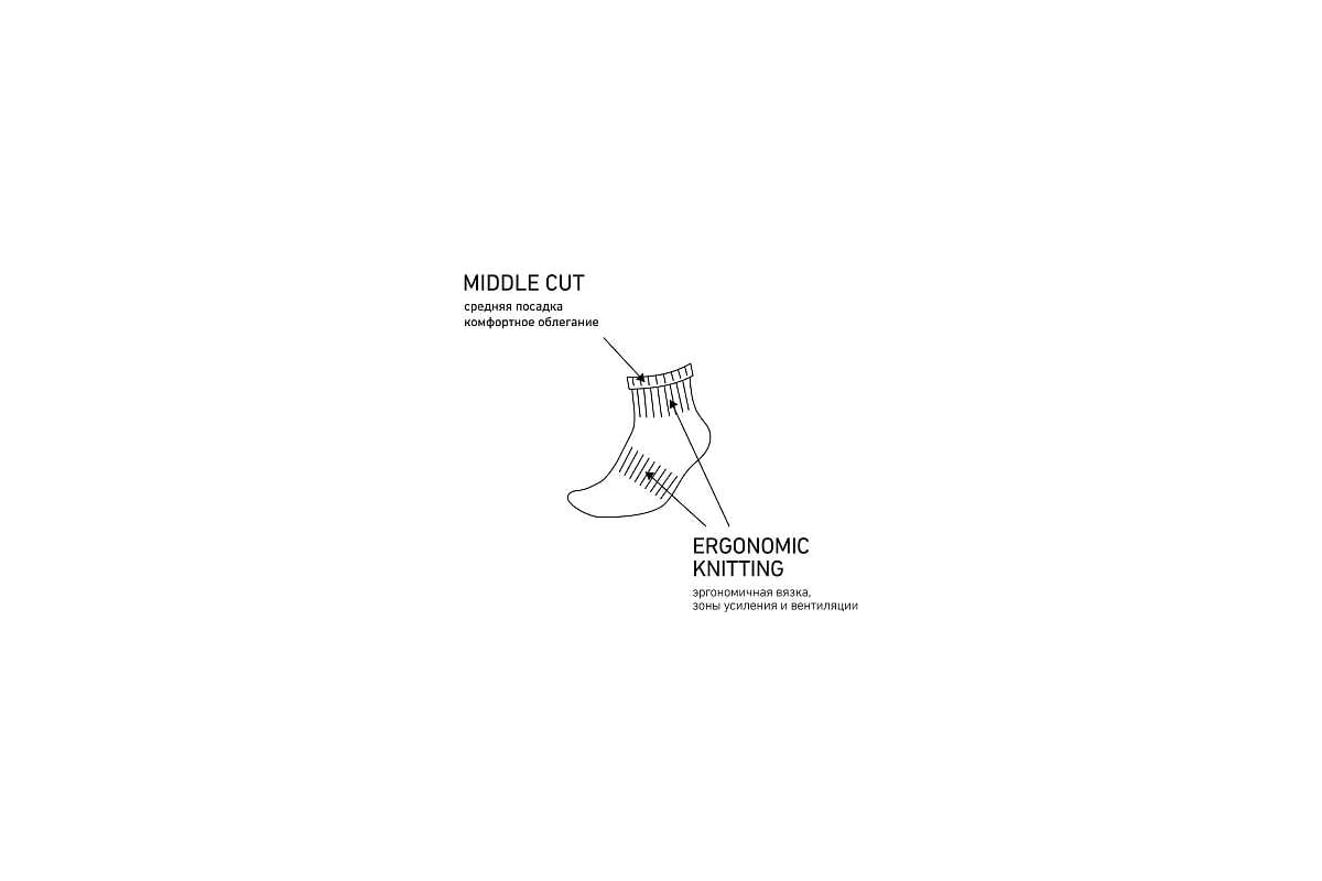 Лента вязки в области свода обеспечивает идеальное плотное прилегание, а рифленые манжеты делают его еще более комфортным. Специально подобранный состав пряжи и его обработка позволяют сохранить сухость стоп даже во время активного использования.