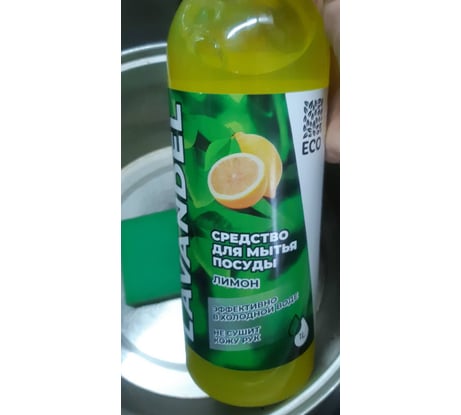 Приемлемый объем, чтобы часто не доливать, высота флакона 26см, к ней подходит дозатор от старой литровой жидкости. Немного жидковато, но цена это перекрывает. Пенится прекрасно, руки не сушит, отмывает нормально в холодной воде. Запах легкий, ненавязчивый - больше апельсин, чем лимон. На посуде не остается, смывается полностью.