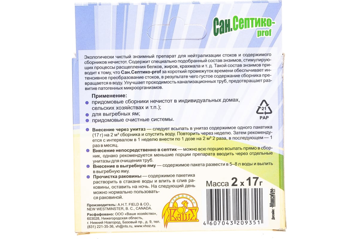 Средство для септиков Сан.Септико-prof (2 шт; 17г) Ваше Хозяйство 4607043209351 предназначен для нейтрализации стоков и содержимого сборников нечистот. Производится из натуральных энзимов, пекарских дрожжей и дрожжевых субстанций (сульфат кальция, хлорид натрия, хлорид аммония и пшеничная мука — в общем 2.1 %).