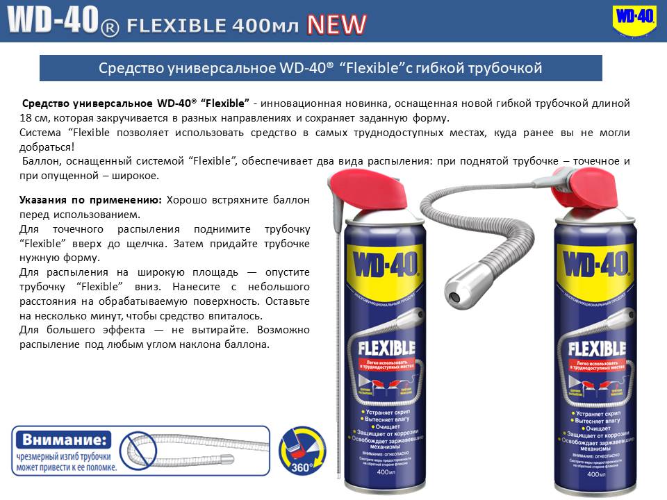 Средство для тысячи применений WD-40 Flexible 400 мл Flexi 70692 – инновационная новинка, оснащенная новой гибкой трубочкой длиной 18 см, которая закручивается в разных направлениях и сохраняет заданную форму. Система Flexible позволяет использовать средство в самых труднодоступных местах, куда ранее не получалось добраться. Баллон, оснащенный системой Flexible, обеспечивает два вида распыления: при поднятой трубочке – точечное, при опущенной – широкое.