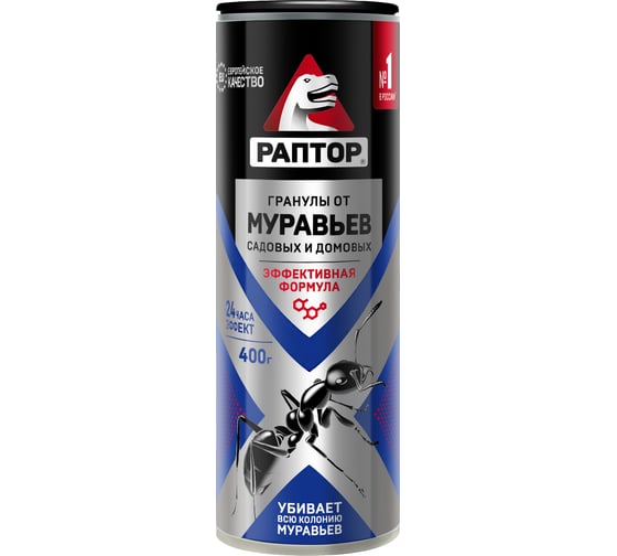 РАПТОР® Средство от муравьев в гранулах надежно борется с домовыми и садовыми муравьями. Благодаря эффективной формуле, в состав которой входит фипронил, результат достигается уже через несколько часов после использования. Средство можно использовать как в сухом, так и в растворенном виде.