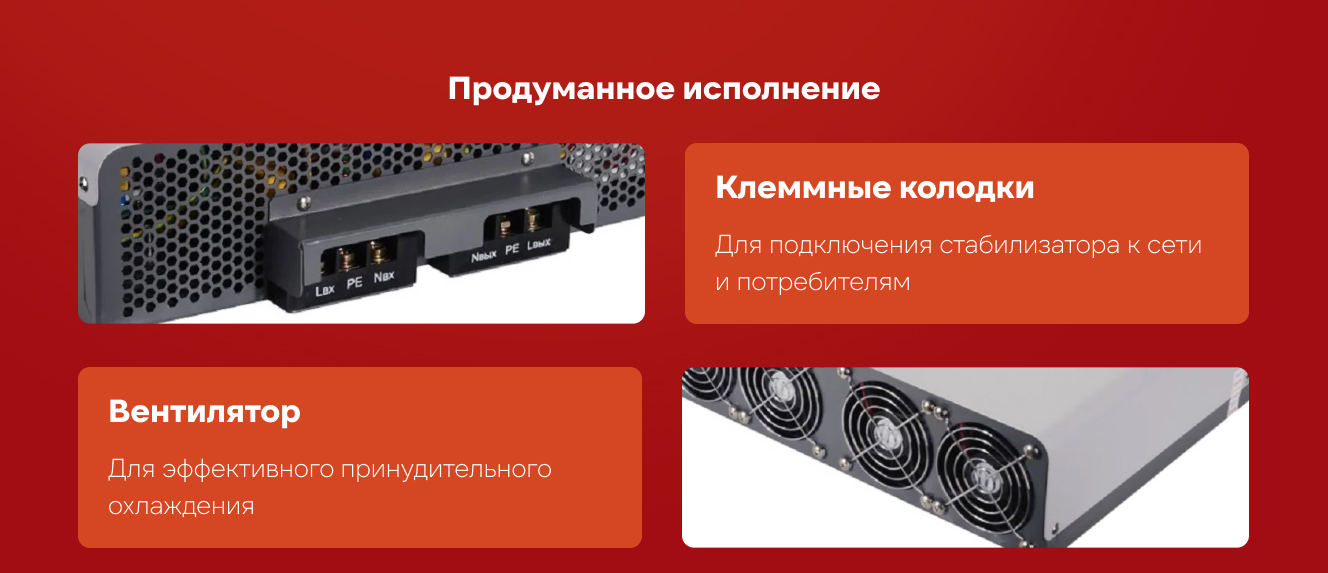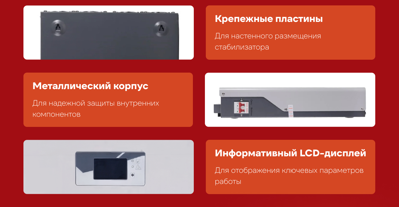 Стабилизатор выдерживает кратковременные перегрузки до 150% (при высоких пусковых токах). Устройство работает при входном напряжении от 90 до 310 В. При выходе за эти пределы автоматически отключает нагрузку, предотвращая поломки.