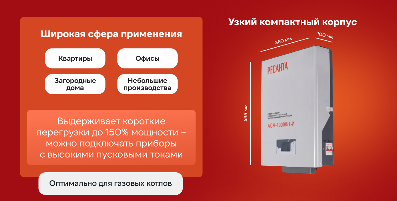 Стабилизатор Ресанта АСН-10000/1-И — это не просто защита одного прибора, а комплексное решение для стабильной работы всех систем дома. Инвестируйте в мощную и умную защиту — обеспечьте себе спокойствие и сохранность дорогостоящей техники.