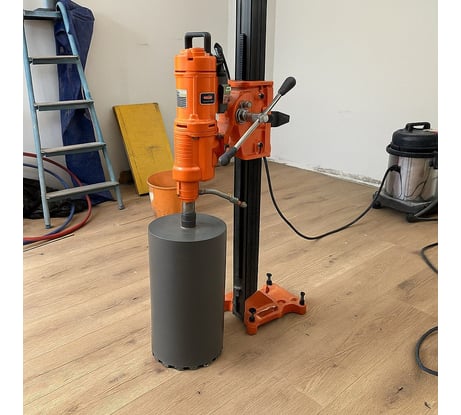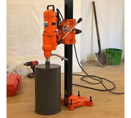 Более продвинутый по стабильности и мощности, даёт чистые отверстия в бетоне. Использовал на стройке — скорость сверления заметно выше, чем у ручной дрели. Принцип тот же — алмазная коронка и водяное охлаждение, долговечно и эффективно.
