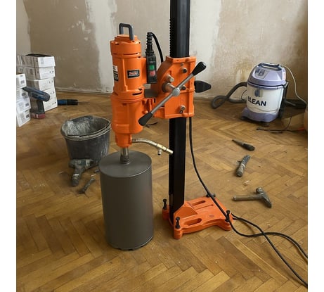 Ещё более «про» версия для частых работ на стройплощадке. Хорошая эргономика, регулировки позволяют тонко подстроиться под задачу. Вода, охлаждение, коронка — и отверстие ровное.