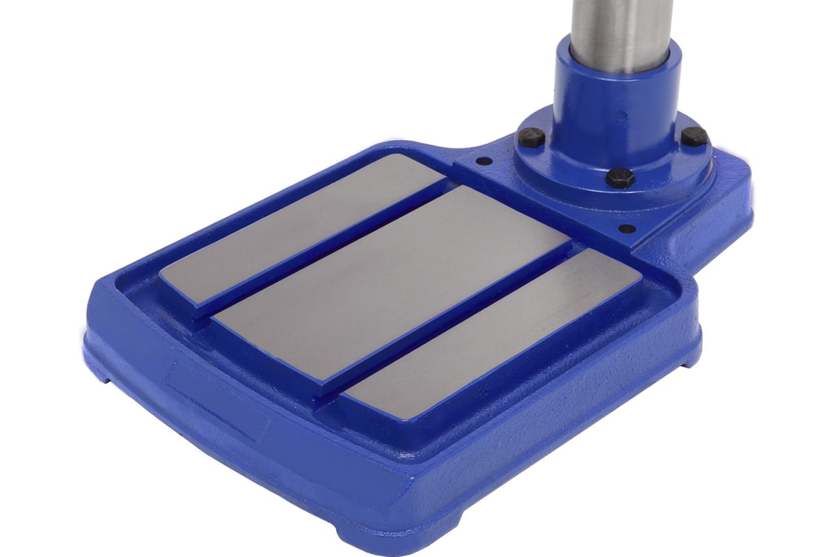 Максимальное расстояние между шпинделем и основанием составляет 540 мм, расстояние от колонны до оси шпинделя составляет 180 мм. Колонна стальная, толстостенная, имеет диаметр 70 мм. Регулировка расстояния шпиндель/основание производится за счет подъема и опускания сверлильной головки с помощью маховика. Сверление заготовок осуществляется с помощью опускания пиноли, ее ход составляет 85 мм.