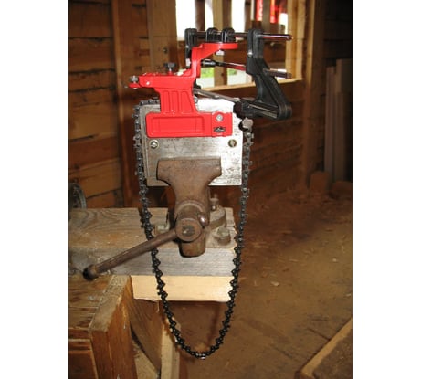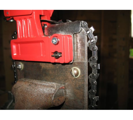 Полезная вещь. При определённой сноровке можно очень качественно заточить цепь и тем самым сэкономить деньги и "пощадить" пилу. Дополнил устройство парой приспособлений (см. фото).