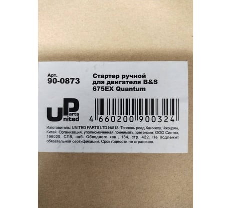 Стартер ручной для двигателя B&S 675EX Quantum (аналог 497680, 498144) UNITED PARTS 90-0873 На страницу товара1 110 ₽