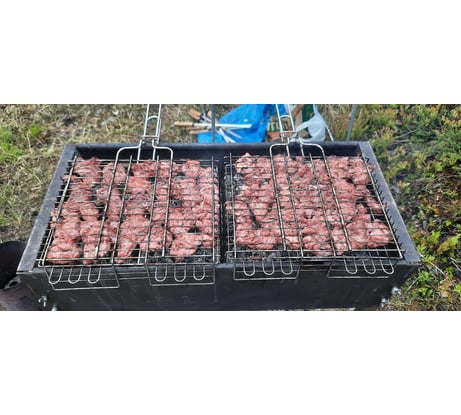 Достаточно толстая сталь, бортики подогнуты сверху поэтому не деформируются, ножки на "барашках", собирается легко, устойчивый, размеры позволяют разместить две решетки или 10 широких шампуров. Сама конструкция хорошо продумана - есть колосник и боковые сдвижные крышки для открытия/закрытия доступа воздуха, таким образом можно быстро "раскочегарить" затухающий уголь. Самое главное - не жрет уголь! Как раз из-за вышеописанной конструкции. Пользуюсь уже 5 лет - ничего нигде не прогорело.