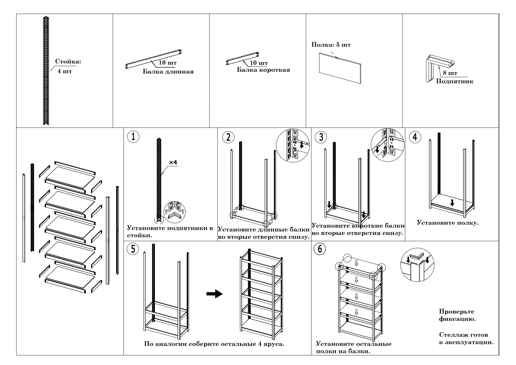 - Система зацепов — стеллаж собирается за 5 минут! Просто соедините элементы, и готово.